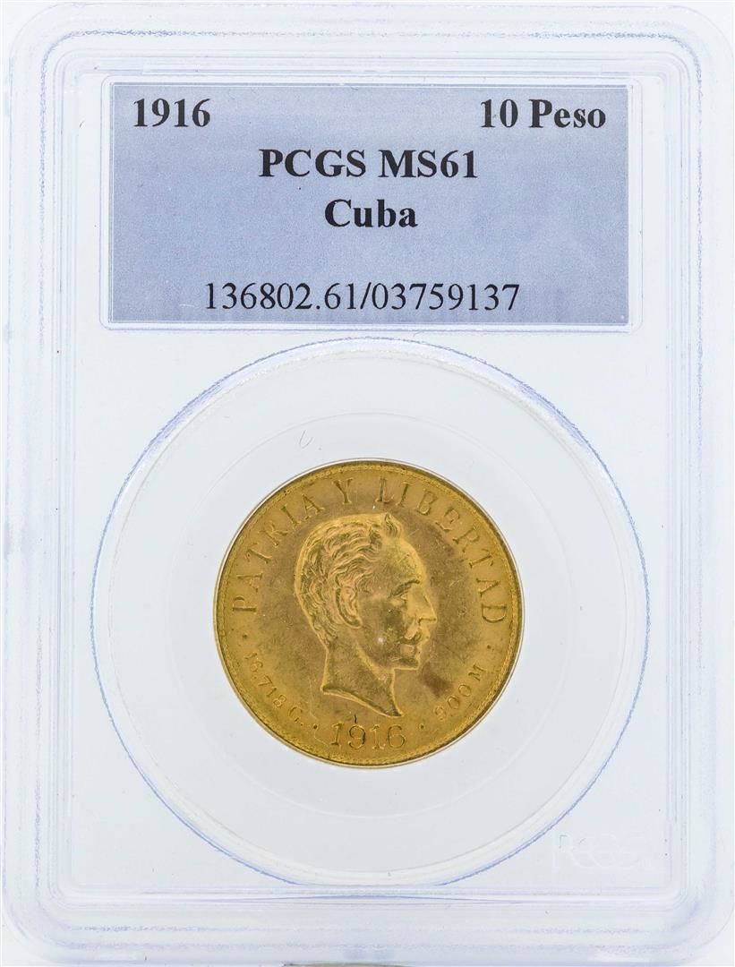 One 1916 Cuba 10 Pesos Gold Coin PCGS MS61. PCGS Certified.