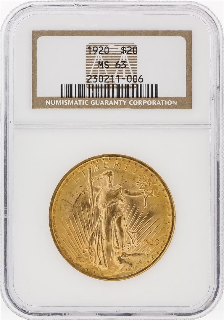 One 1920 NGC MS63 $20 St. Gaudens Double Eagle Coin. NGC Certified.