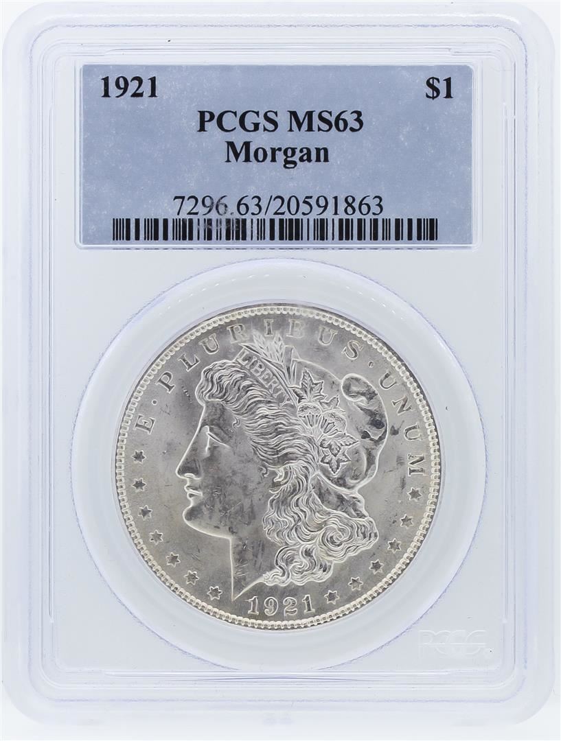 One 1921 PCGS MS63 Morgan Silver Dollar. PCGS Certified.