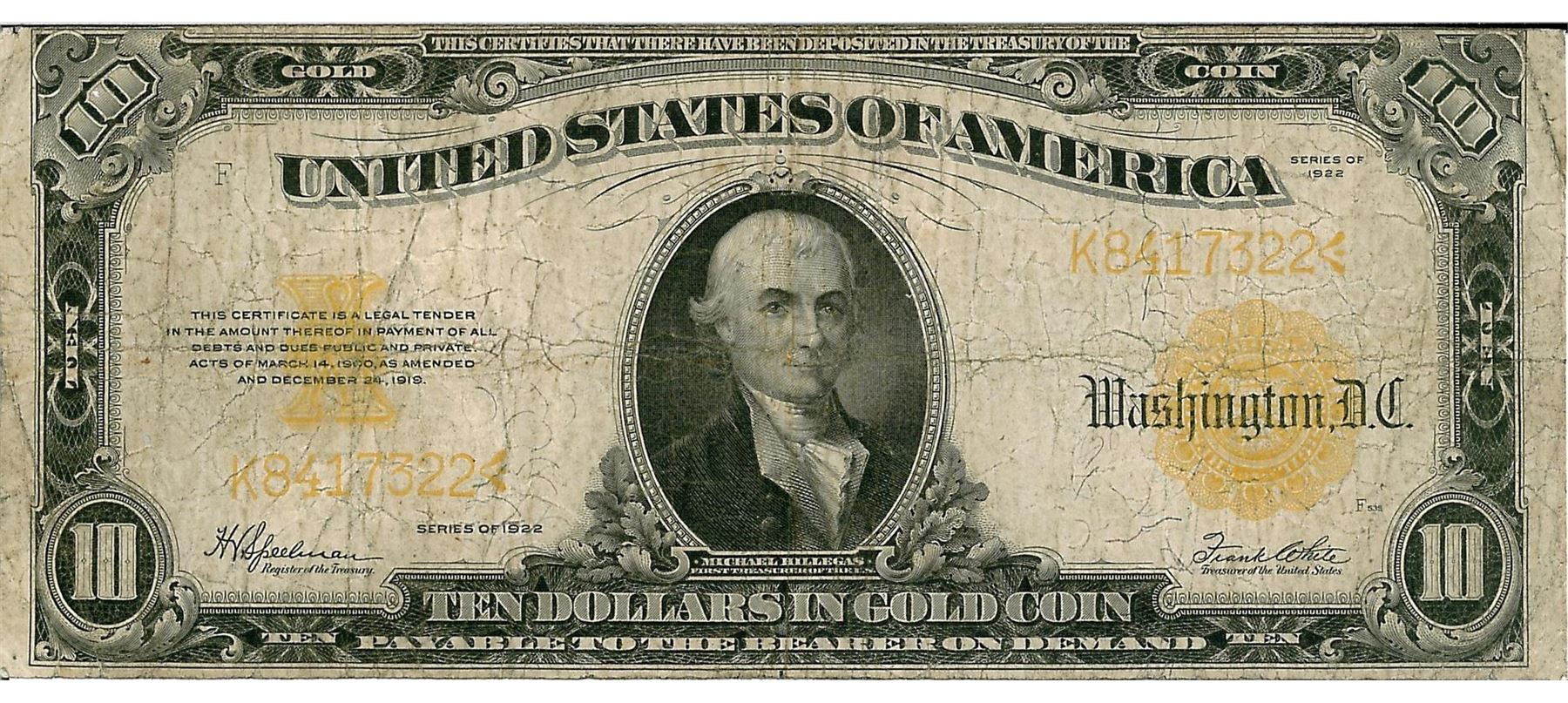 One 1922 $10 Gold Certificate Bank Note. The serial number is 8417322.