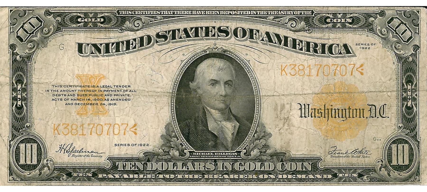 One 1922 $10 Gold Certificate Bank Note. The serial number is 38170707.