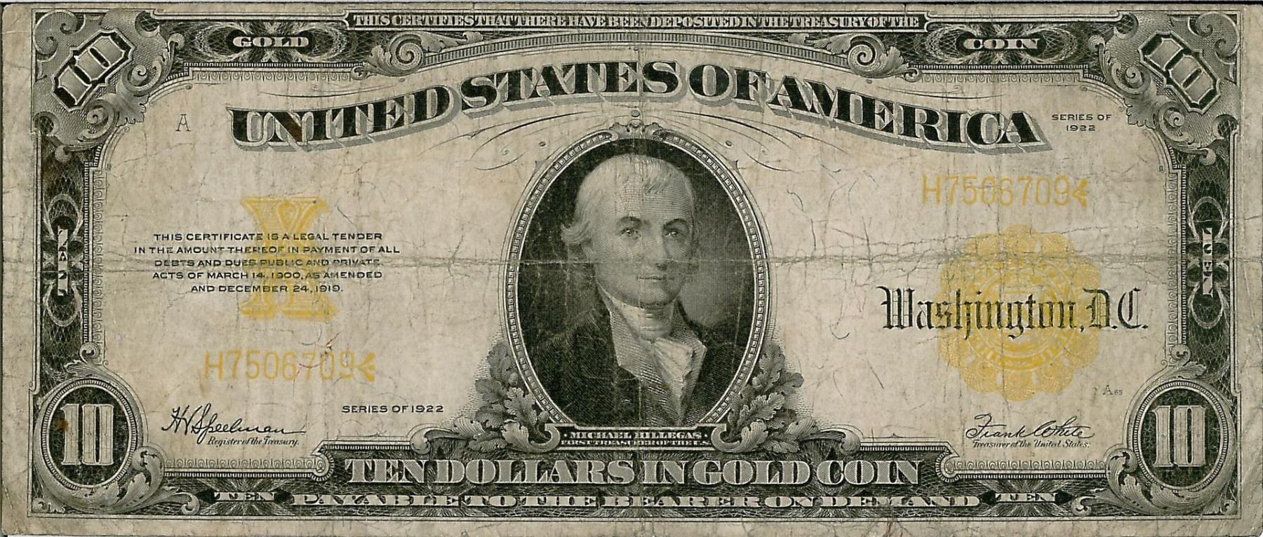 One 1922 $10 Gold Certificate Bank Note. The serial number is 7506709.