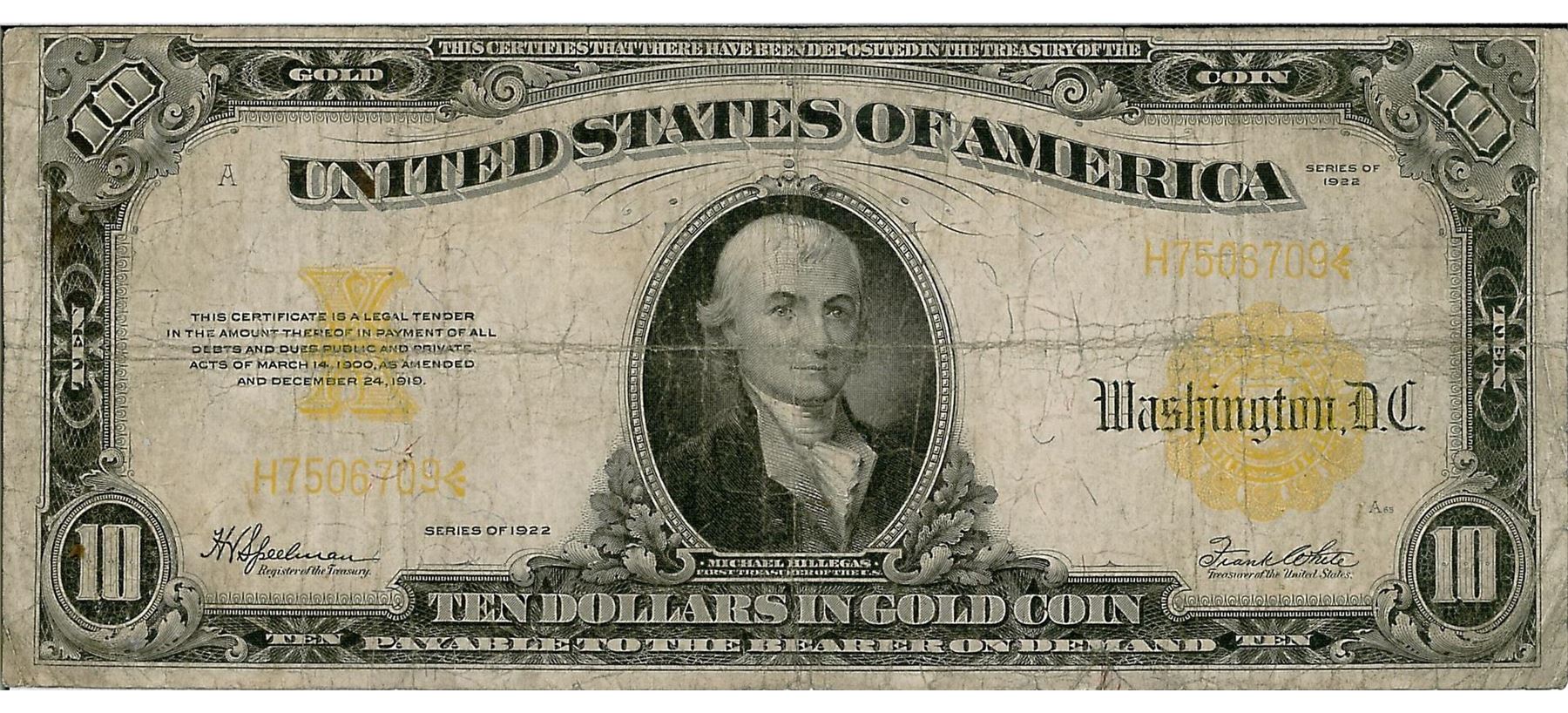One 1922 $10 Gold Certificate Bank Note. The serial number is 7506709.