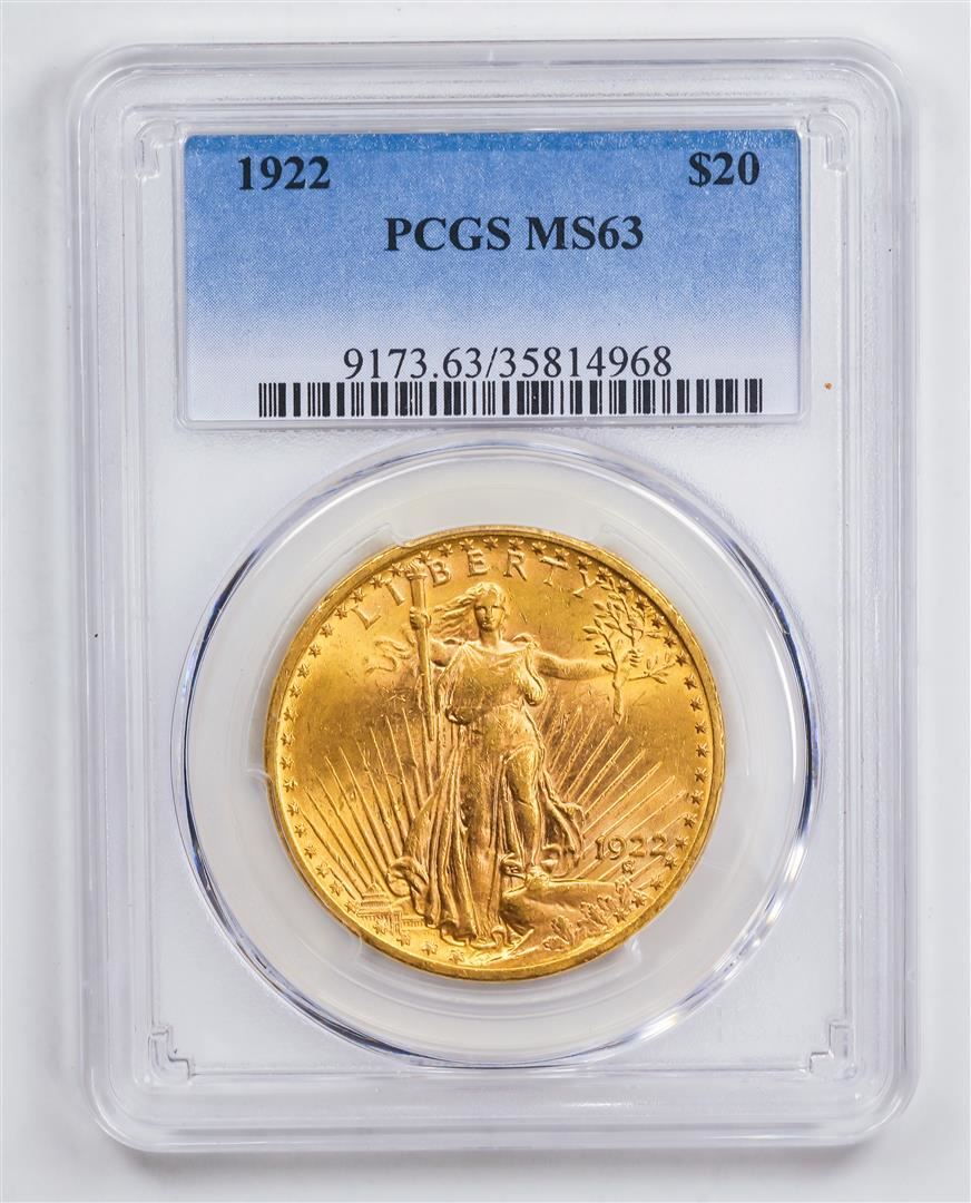 One 1922 $20 Double Eagle Gold Coin PCGS MS63.
