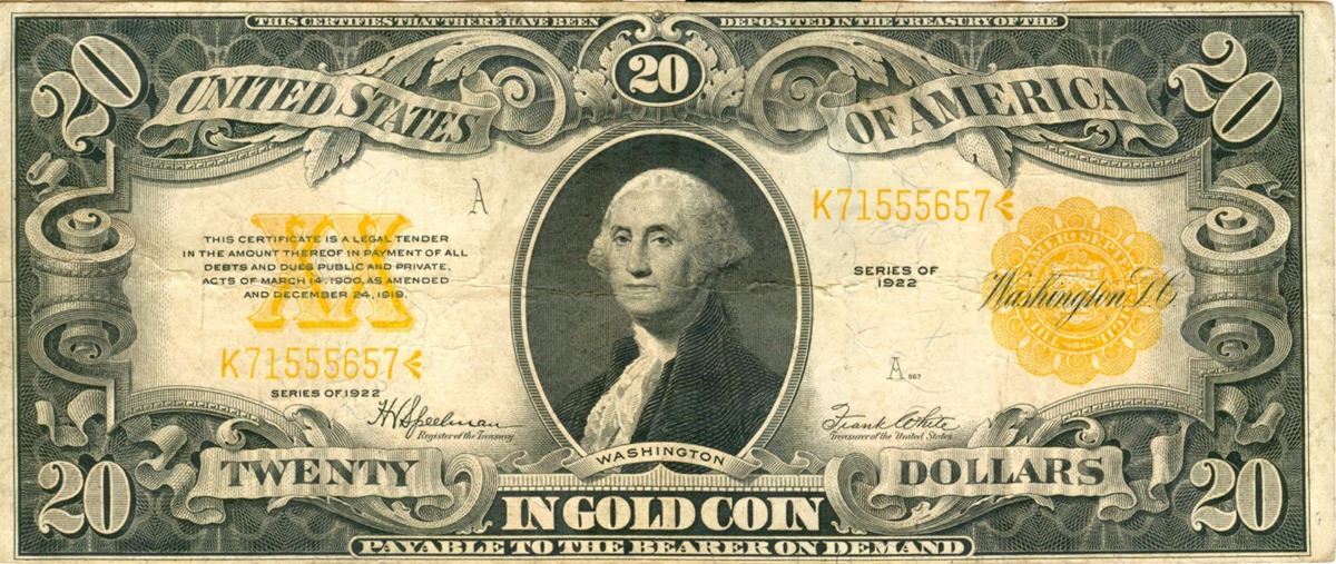 One 1922 Large Note $20 United States Gold Certificate.