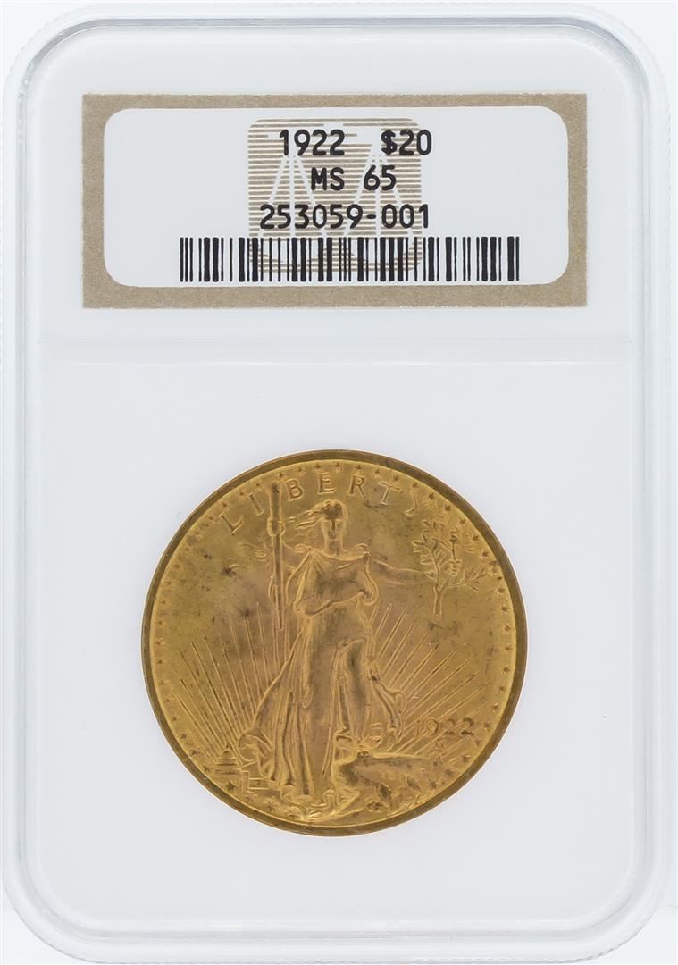 One 1922 NGC MS65 $20 St. Gaudens Double Eagle Gold Coin. Gem examples like this one are extremely rare and not easily found making this coin an attraction to any serious coin collector. NGC Certified.