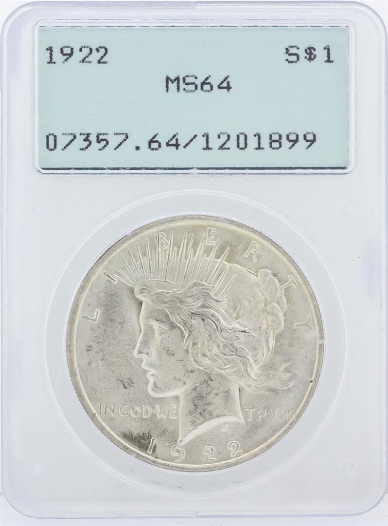 One 1922 PCGS MS64 Peace Silver Dollar. PCGS Certified.