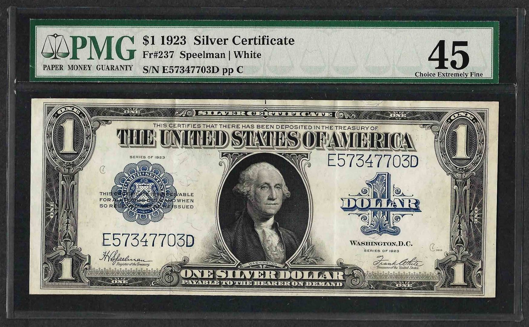 One 1923 $1 Silver Certificate Note Fr.237 PMG Choice Extremely Fine 45. PMG Appraised.