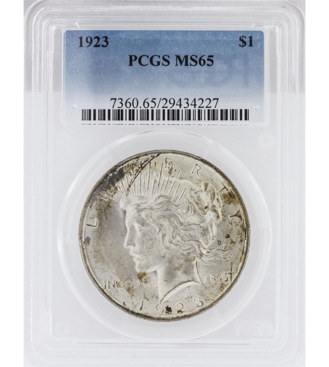 One 1923 MS65 Peace Silver Dollar. PCGS Certified.