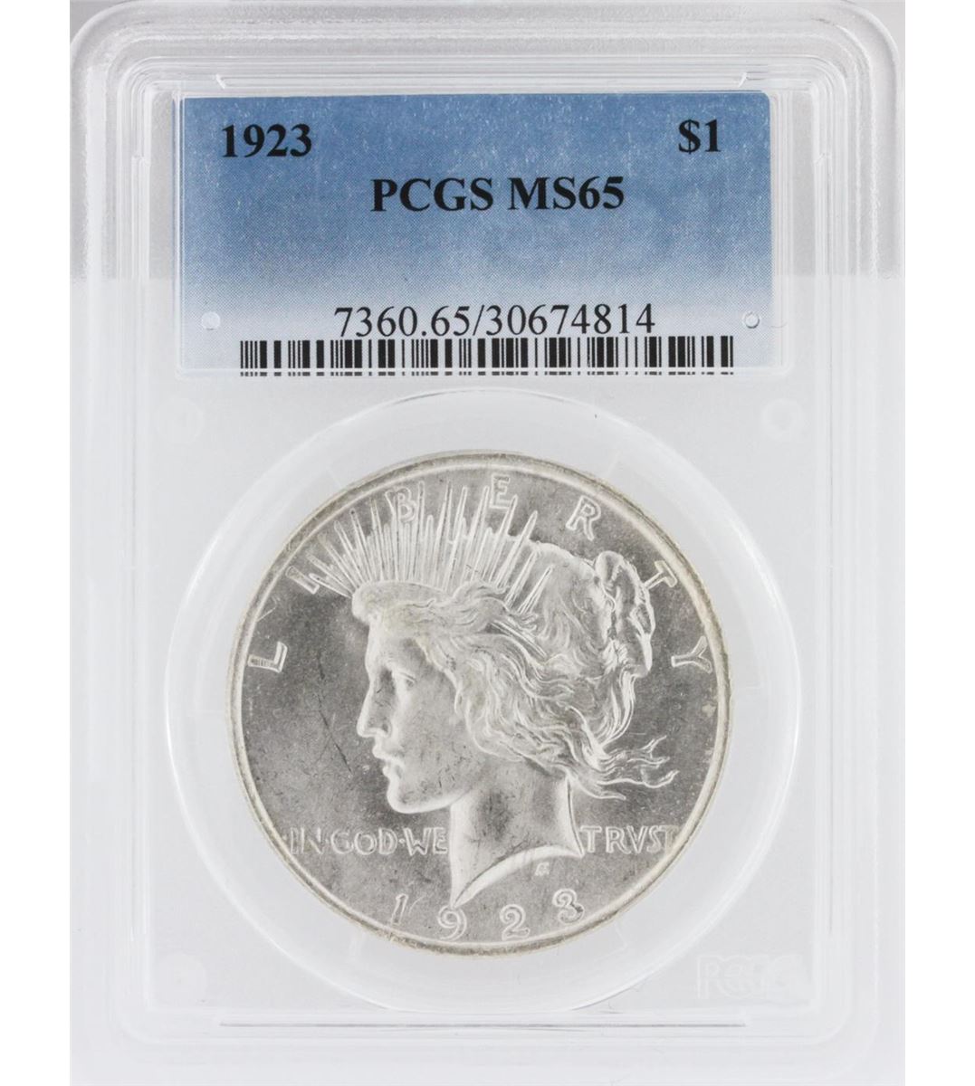 One 1923 MS65 Peace Silver Dollar. PCGS Certified.