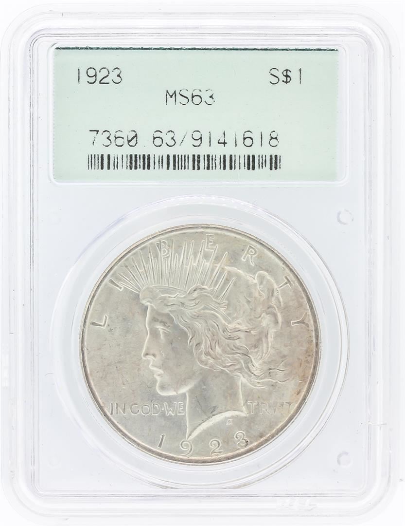 One 1923 PCGS MS63 Peace Silver Dollar. PCGS Certified.