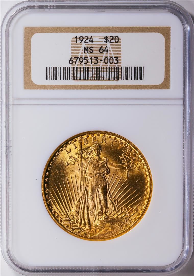 One 1924 $20 Saint Gaudens Double Eagle Gold Coin NGC MS64.