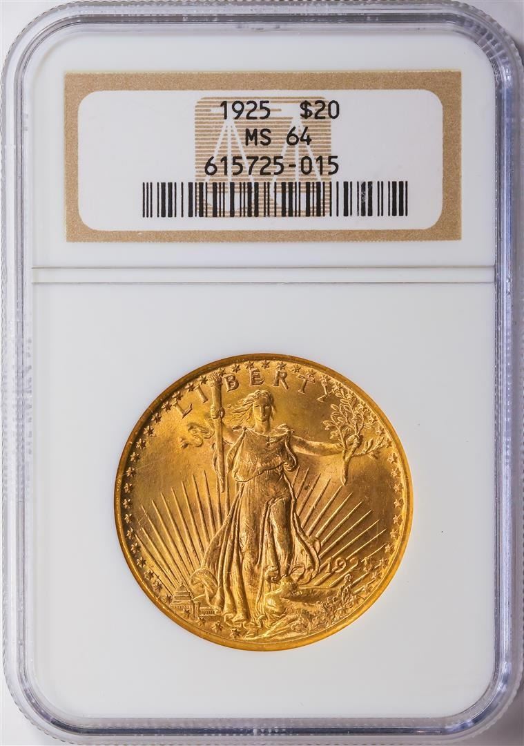 One 1925 $20 Saint Gaudens Double Eagle Gold Coin NGC MS64.