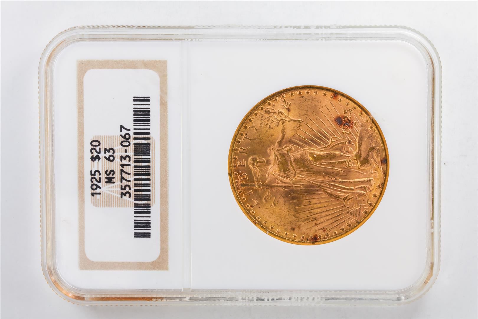 One 1925 $20 St. Gaudens Double Eagle Gold Coin MS63.