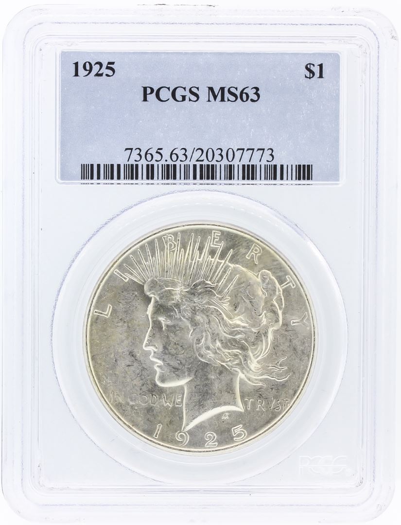 One 1925 PCGS MS63 Peace Silver Dollar. PCGS Certified.