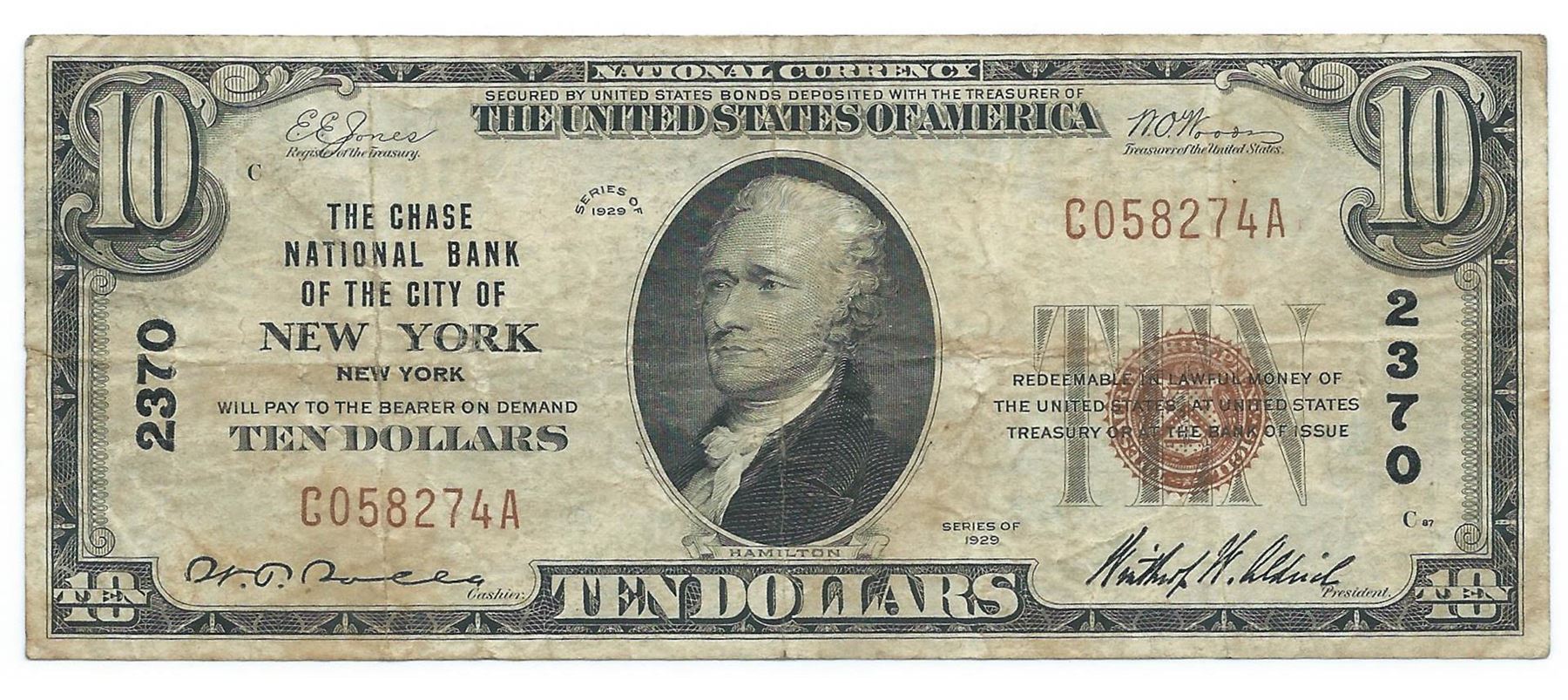One 1929 $10 Note from the Chase National Bank of the City of New York