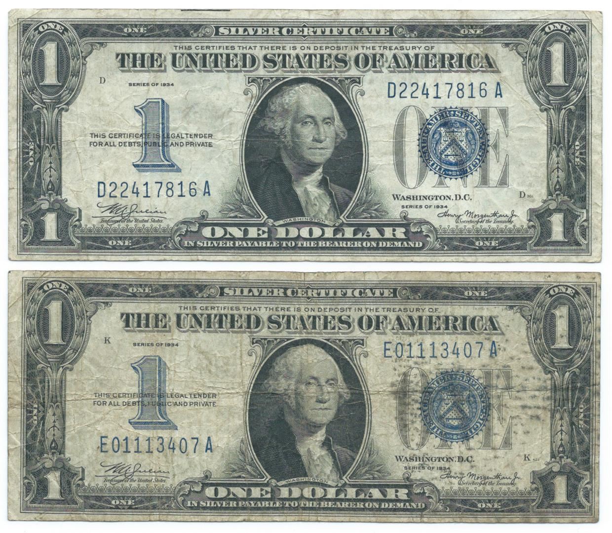 One 1934 $1 Silver Certificate Currency Lot of 2.