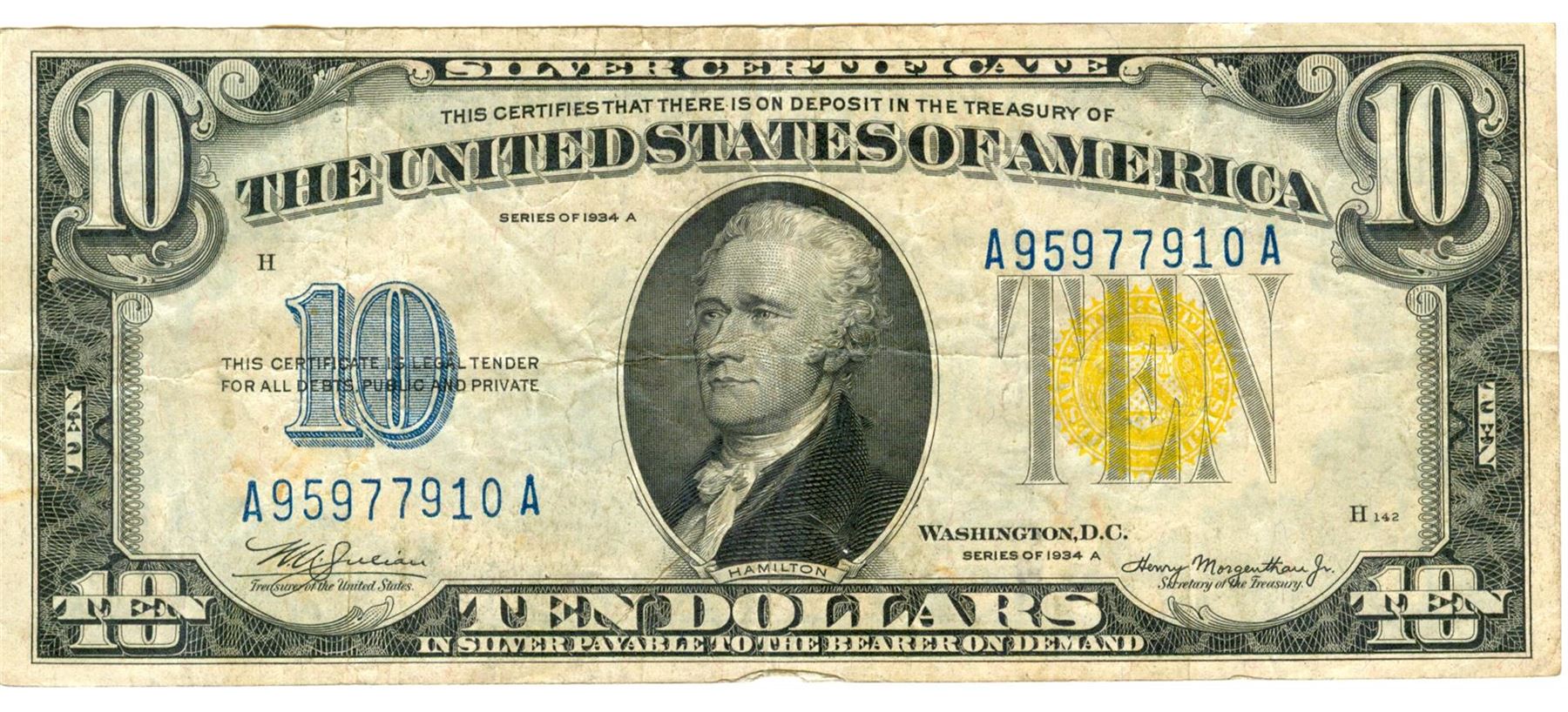 1934 $10 Fine North Africa Silver Certificate Currency.