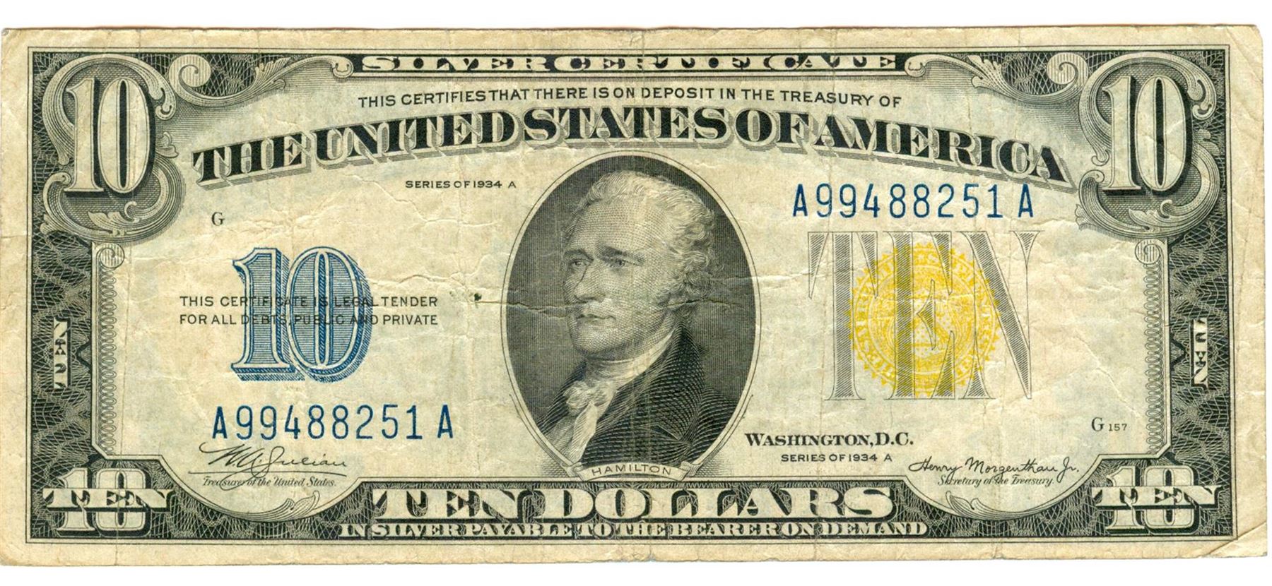 1934 $10 Fine North Africa Silver Certificate Currency.