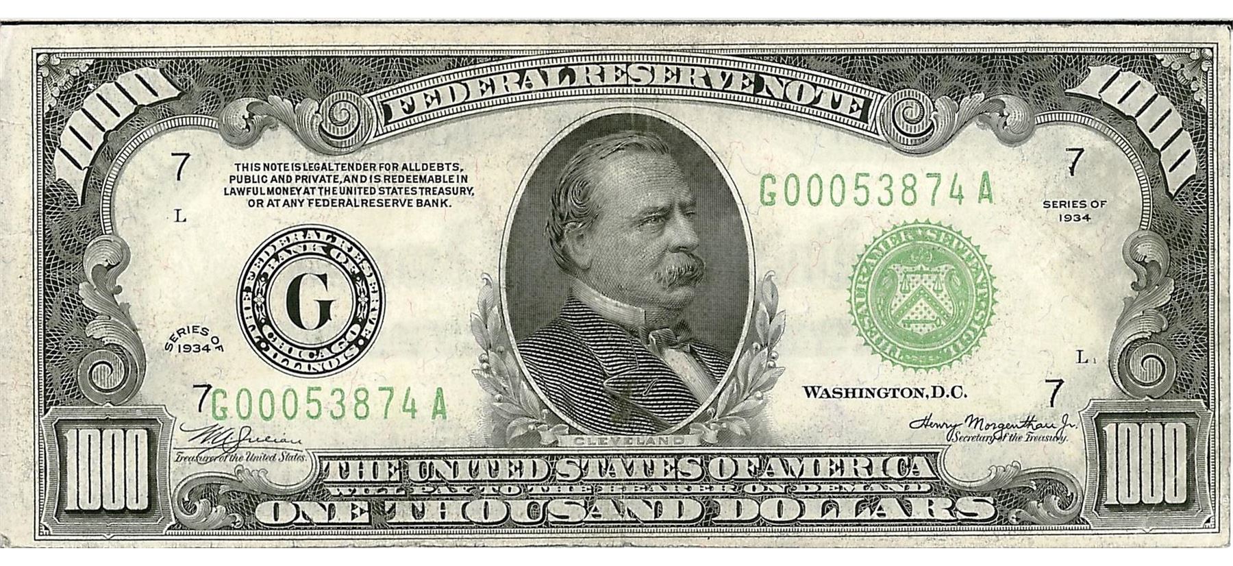 One 1934 $1000 Federal Reserve Bank Note Chicago. The serial number is 53874.