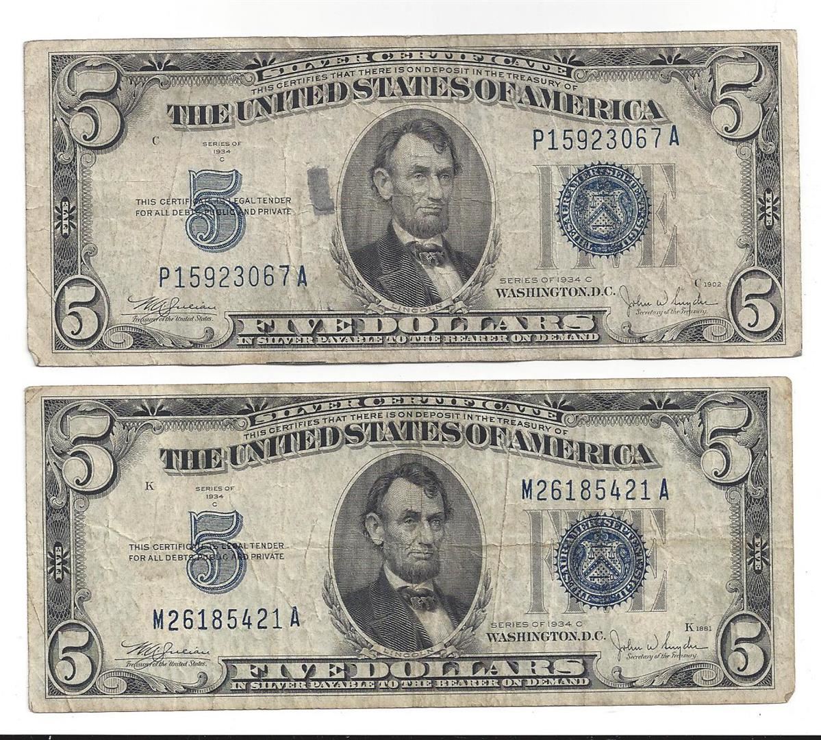 1934 $5 Silver Certificate Currency Lot of 2.