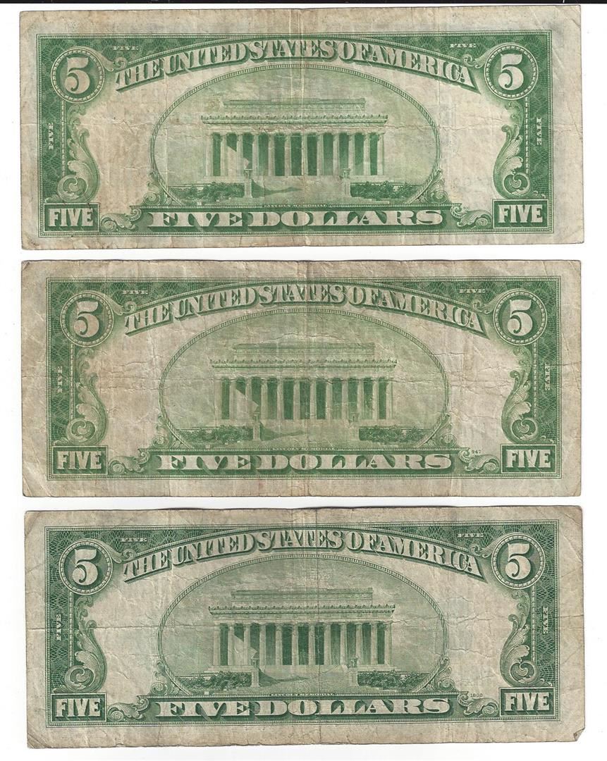 1934 $5 Silver Certificate Currency Lot of 3.