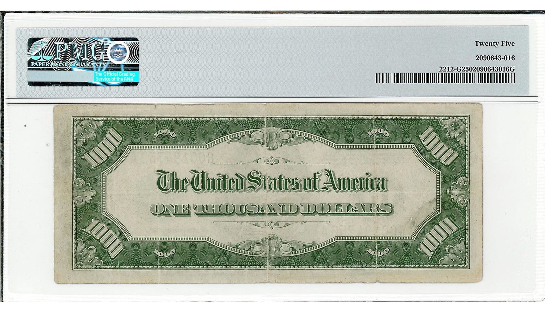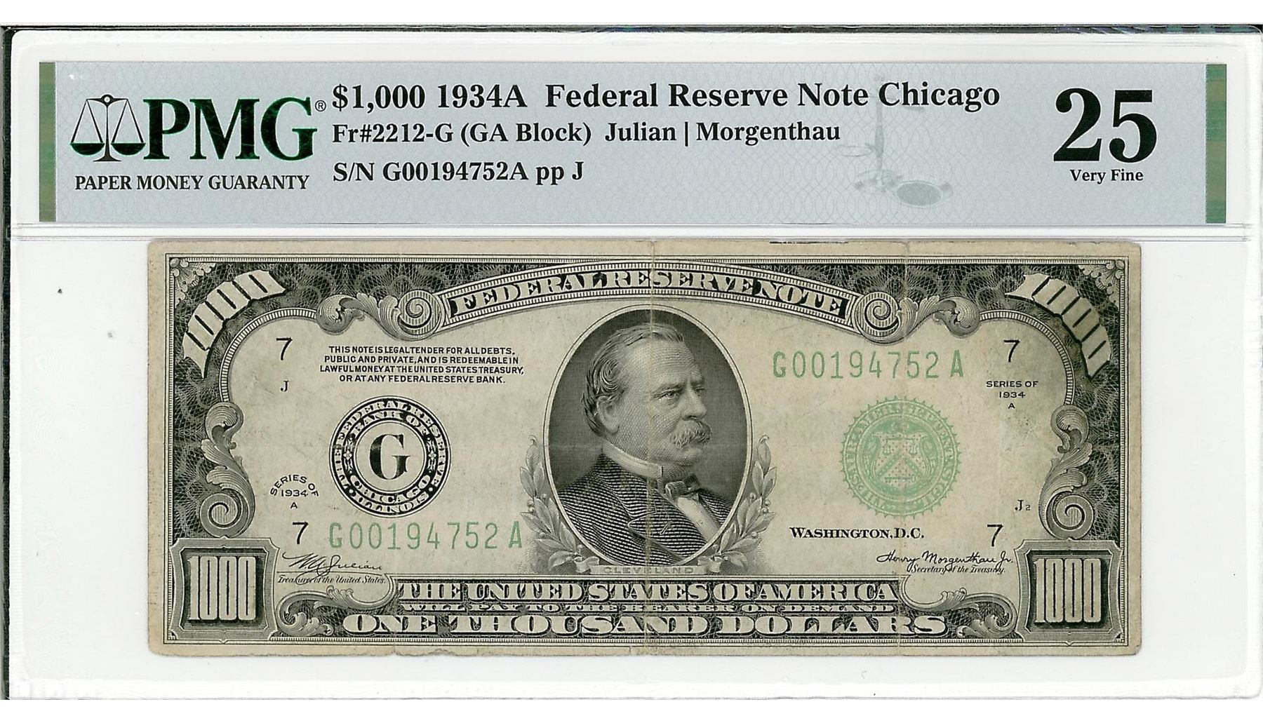 One 1934A $1000 Federal Reserve Bank Note Chicago PMG 30 Very Fine. The serial number is 194752.