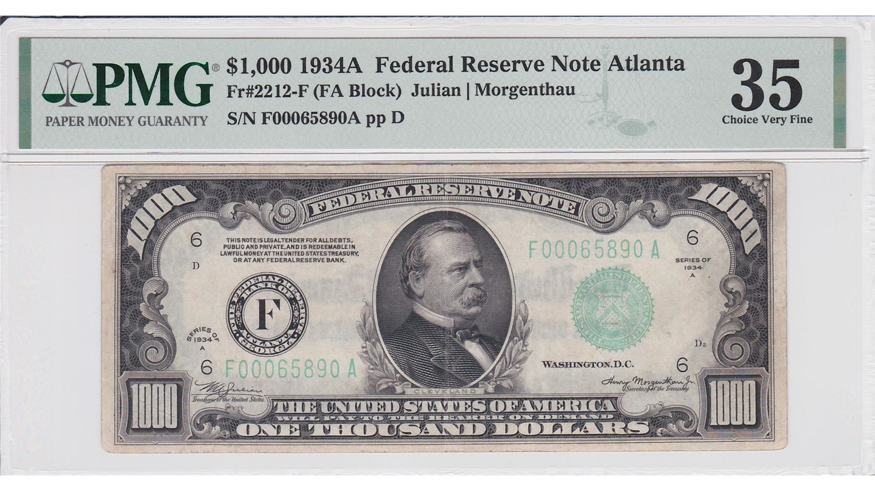 One 1934A $1000 Federal Reserve Note Atlanta.