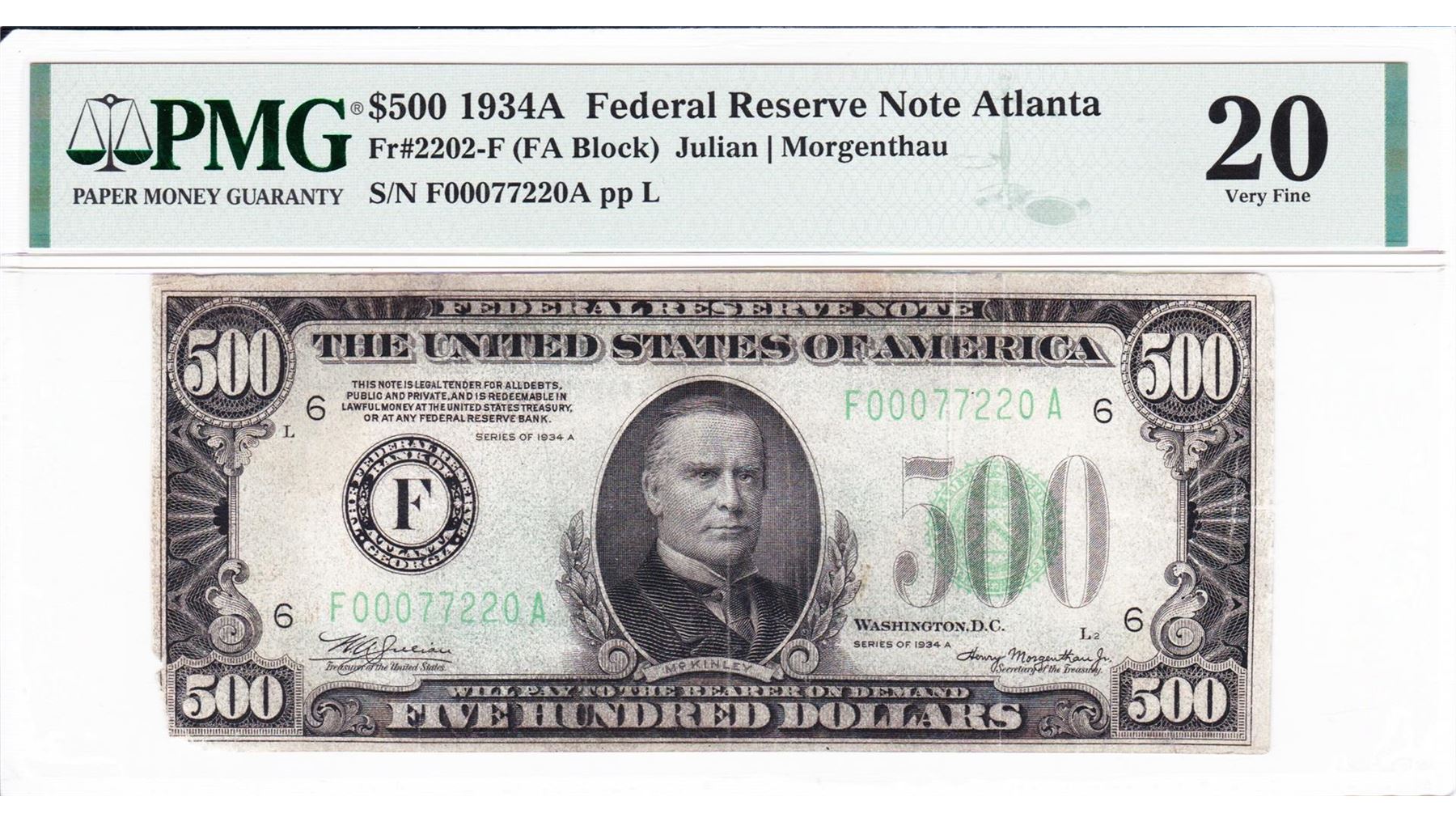 One 1934A $500 Federal Reserve Note Atlanta PMG20 Very Fine.