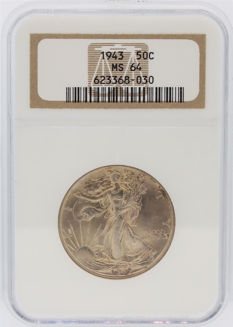 One 1943 NGC Graded MS64 Walking Liberty Half Dollar Silver Coin. NGC Certified.