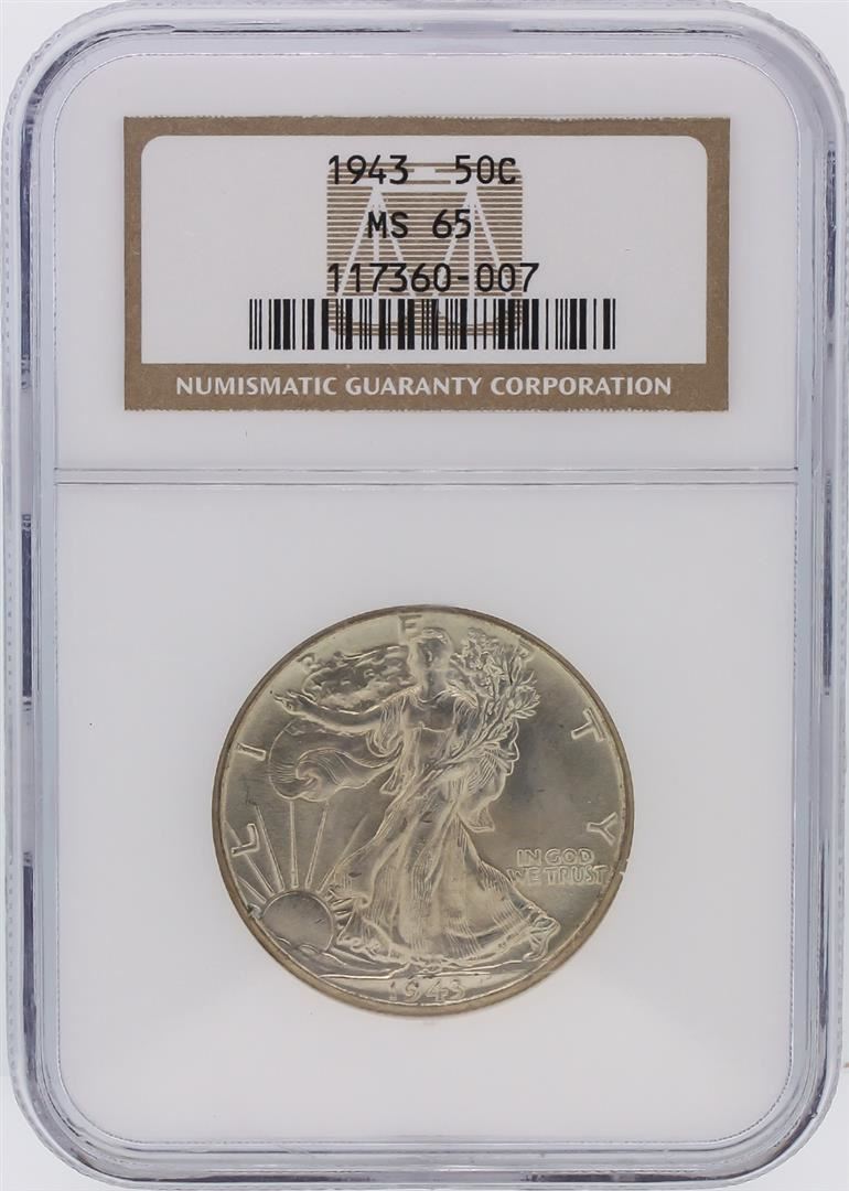 One 1943 NGC Graded MS65 Walking Liberty Half Dollar Silver Coin. NGC Certified.