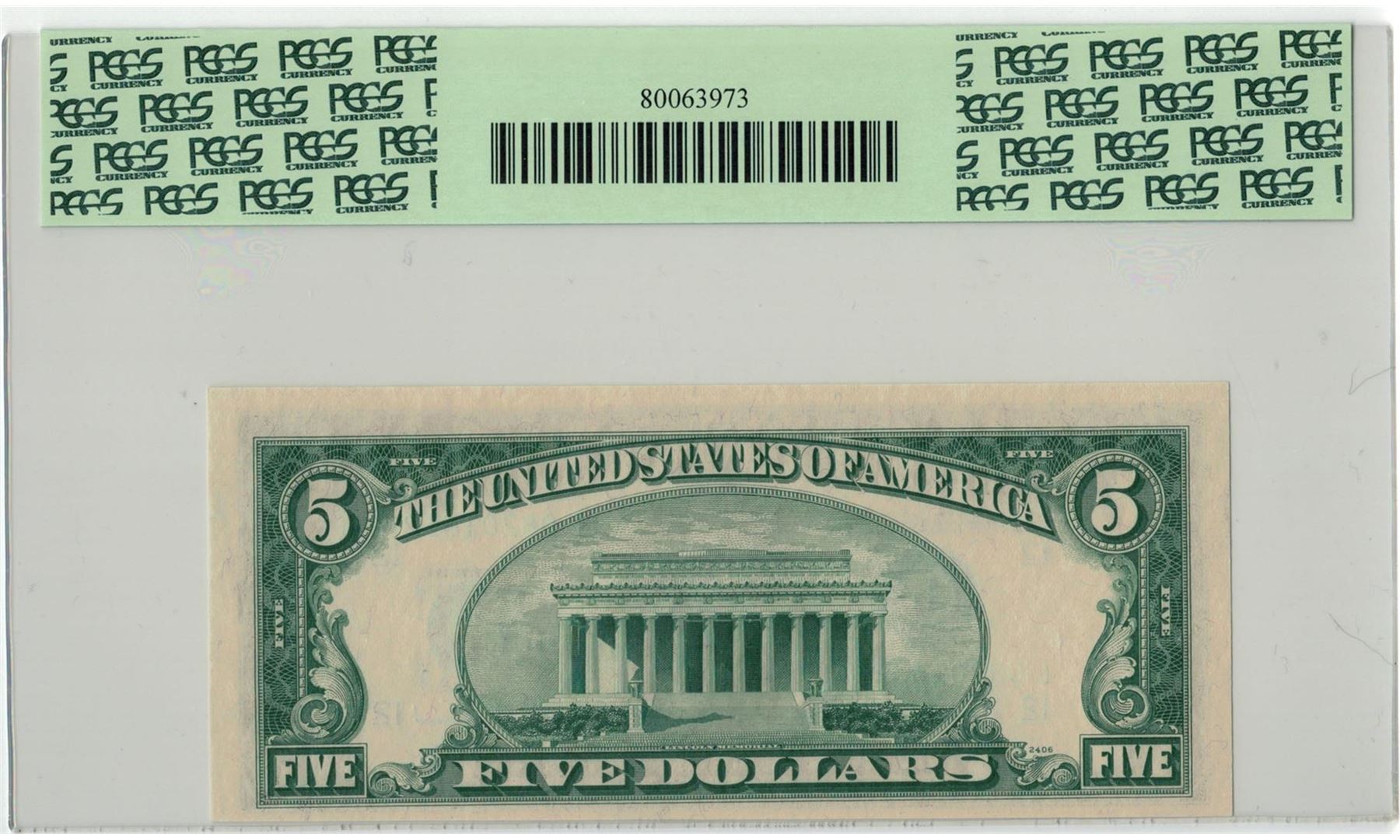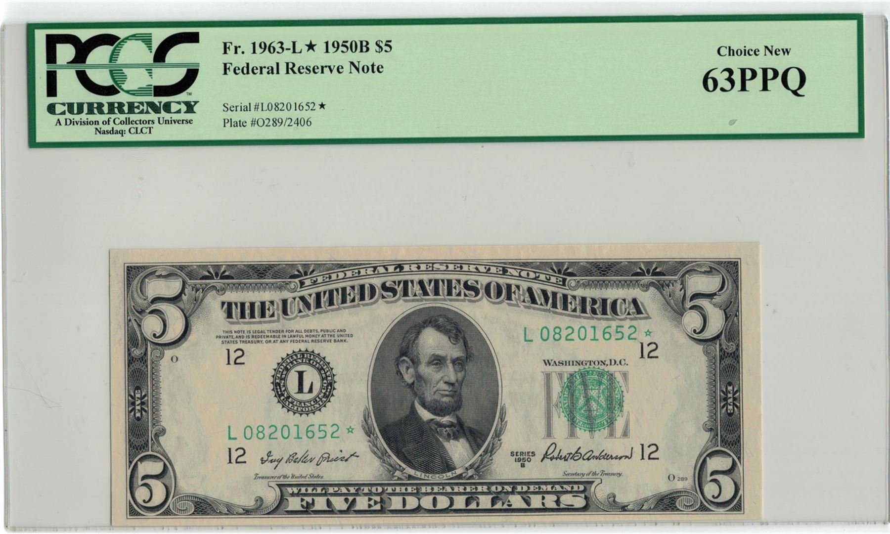 1950-B $5 PCGS Choice New 63PPQ Federal Reserve Note. PCGS Certified.
