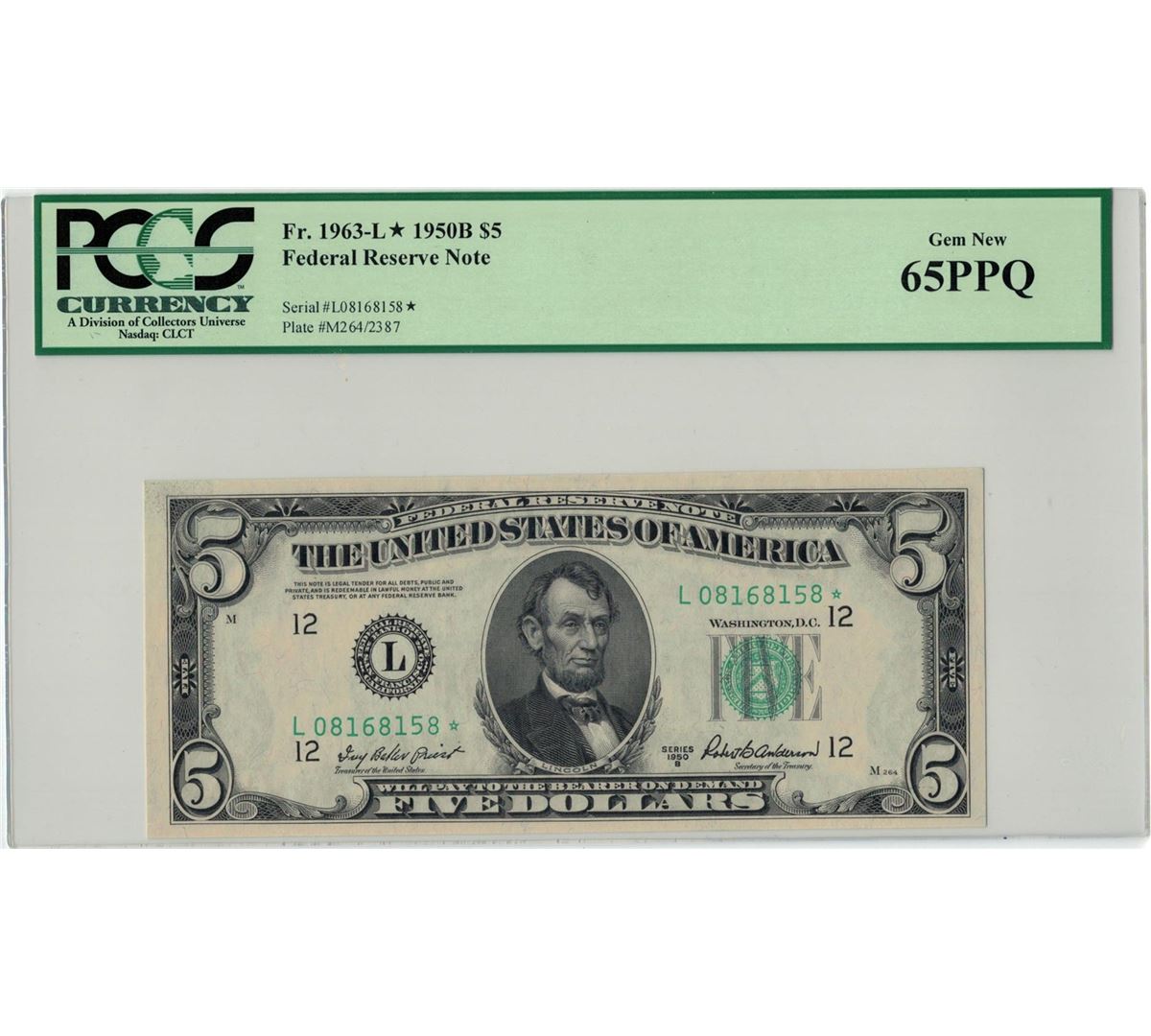 1950-B $5 PCGS Gem New 65PPQ Federal Reserve Note. PCGS Certified.