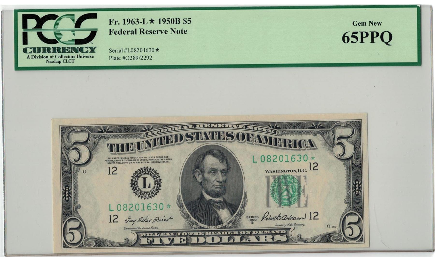 1950-B $5 PCGS Gem New 65PPQ Federal Reserve Note. PCGS Certified.