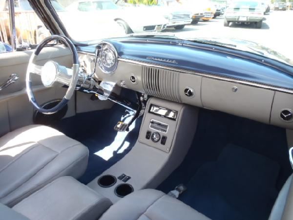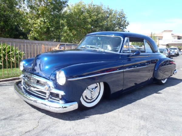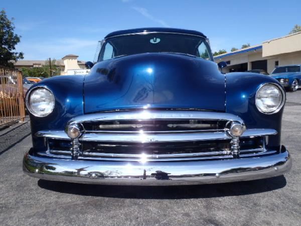 1950 Chevrolet Bel Air. DR10204PK. This razor straight 50 has a high quality metallic blue paint job, hidden "Phantom" tail light, four wheel Air Ride suspension, power front disc brakes, front and rear sway bars, triple plated chrome appointments, 383 stroker engine, polished headers, Edelbrock manifold and carburetor, TH 350 transmission, 12-bolt rear end, and Coker wide whites. The interior has grey ultra-leather seats, cold Vintage A/C, CD stereo system, custom console, power windows, power door poppers, power trunk release, and tilt steering wheel.