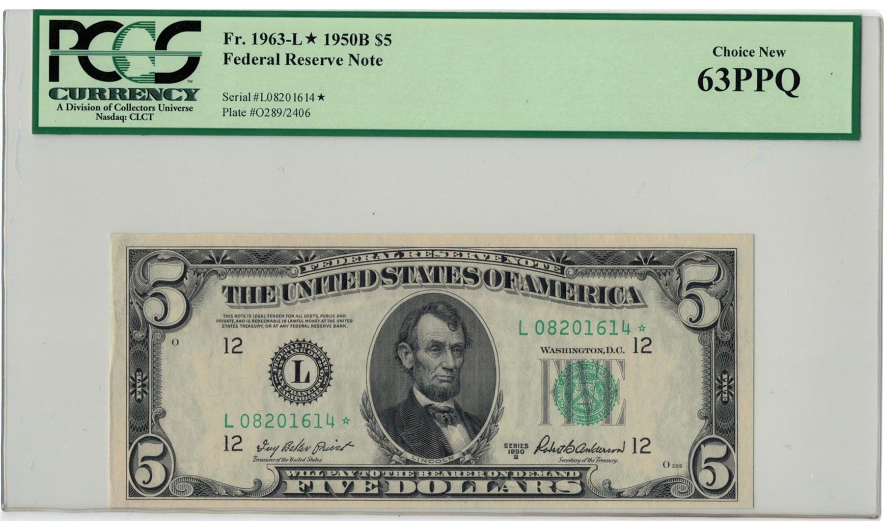 One 1950B PCGS CN 63PPQ $5 Federal Reserve Note. PCGS Certified.