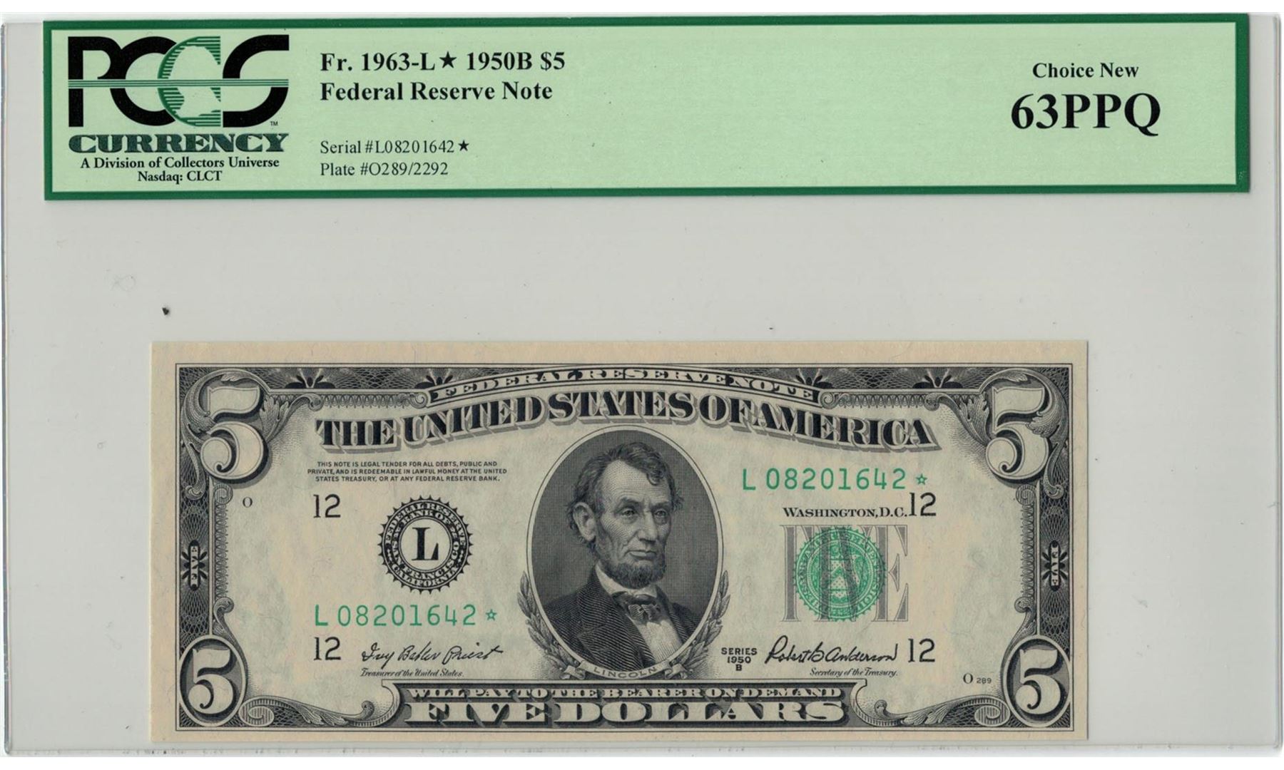 One 1950B PCGS CN 63PPQ $5 Federal Reserve Note. PCGS Certified.