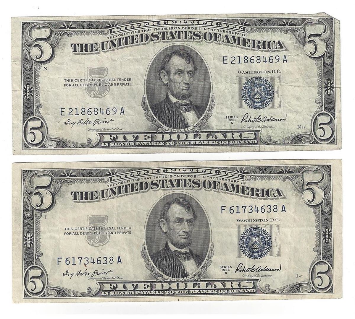 1953 $5 Silver Certificate Currency Lot of 2.