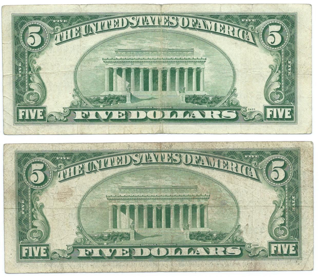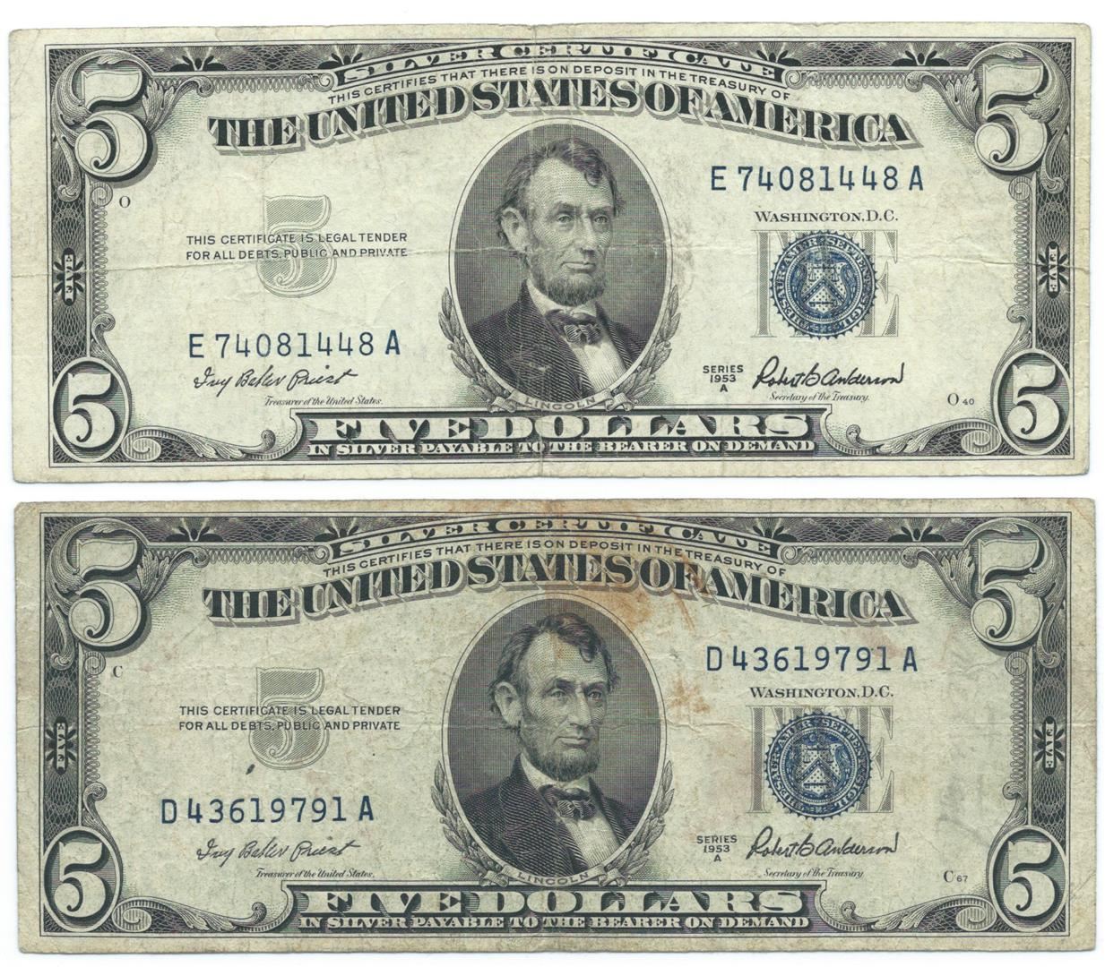 One 1953 $5 Silver Certificate Currency Lot of 2.