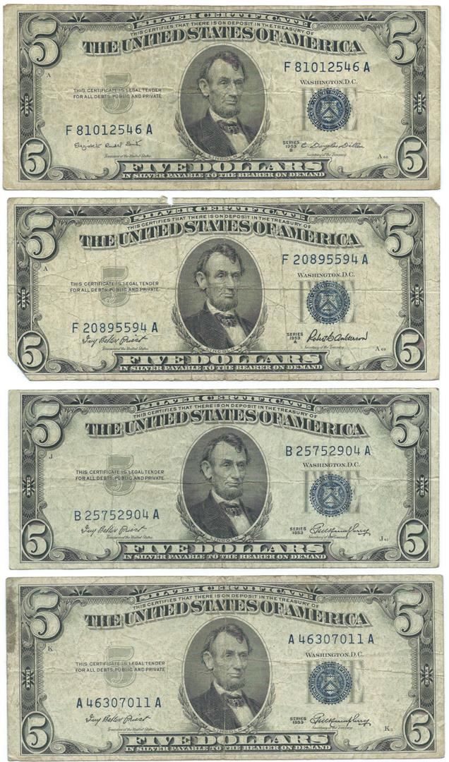 One 1953 $5 Silver Certificate Currency Lot of 4.
