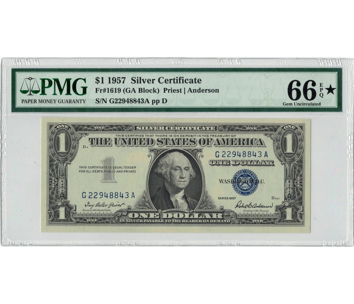 One 1957 PMG GU 66EPQ $1 Silver Certificate.