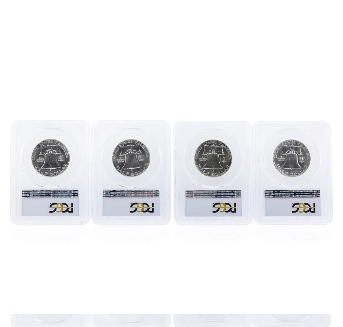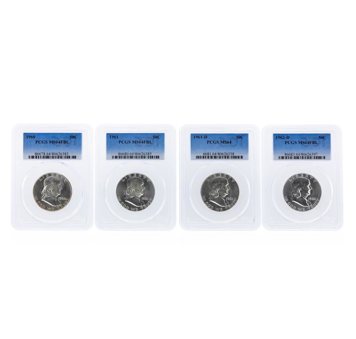 One 1960-1962 PCGS 50 Cent Half Dollar Coin Set. The set features a 1960 PCGS MS64FBL 50 Cent Half Dollar, 1961 PCGS MS64FBL 50 Cent Half Dollar, 1961-D PCGS MS64 50 Cent Half Dollar, 1962-D PCGS MS64FBL 50 Cent Half Dollar. PCGS Certified.