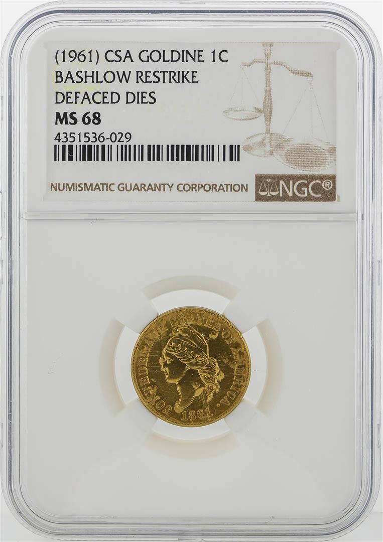One 1961 CSA 1 Cent Goldine Coin Bashlow Restrike NGC MS68. NGC Certified.