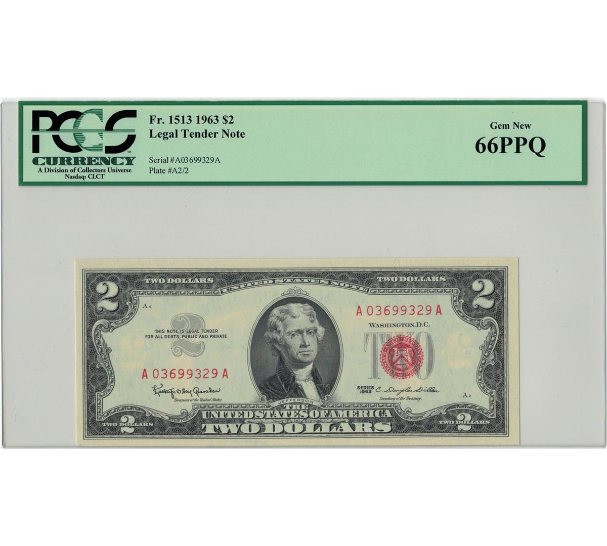 1963 $2 PCGS Gem New 66PPQ Legal Tender Note. PCGS Certified.