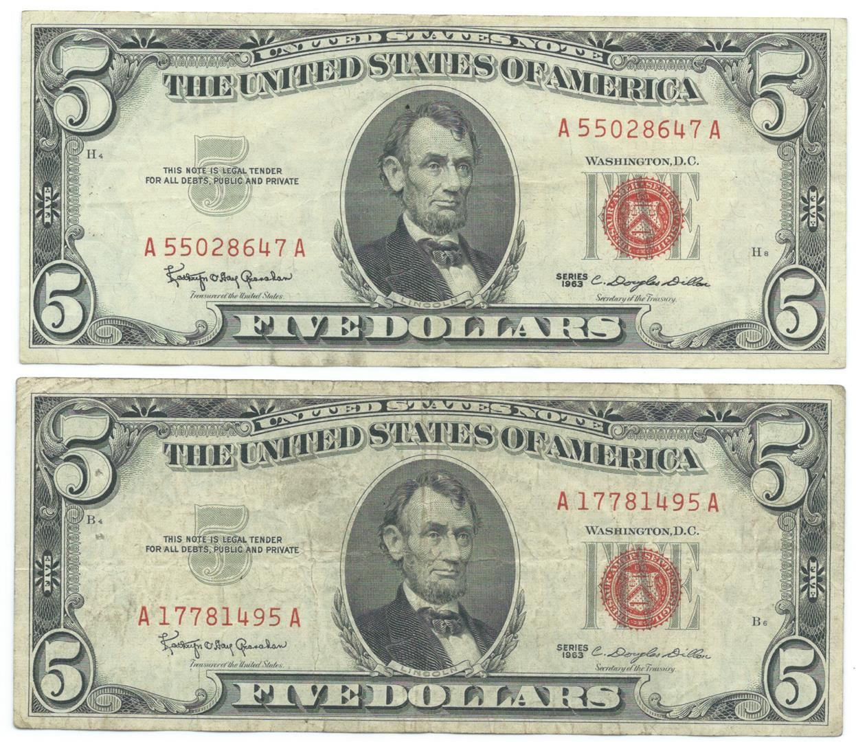 One 1963 $5 Fine Red Seal Bill Lot of 2.