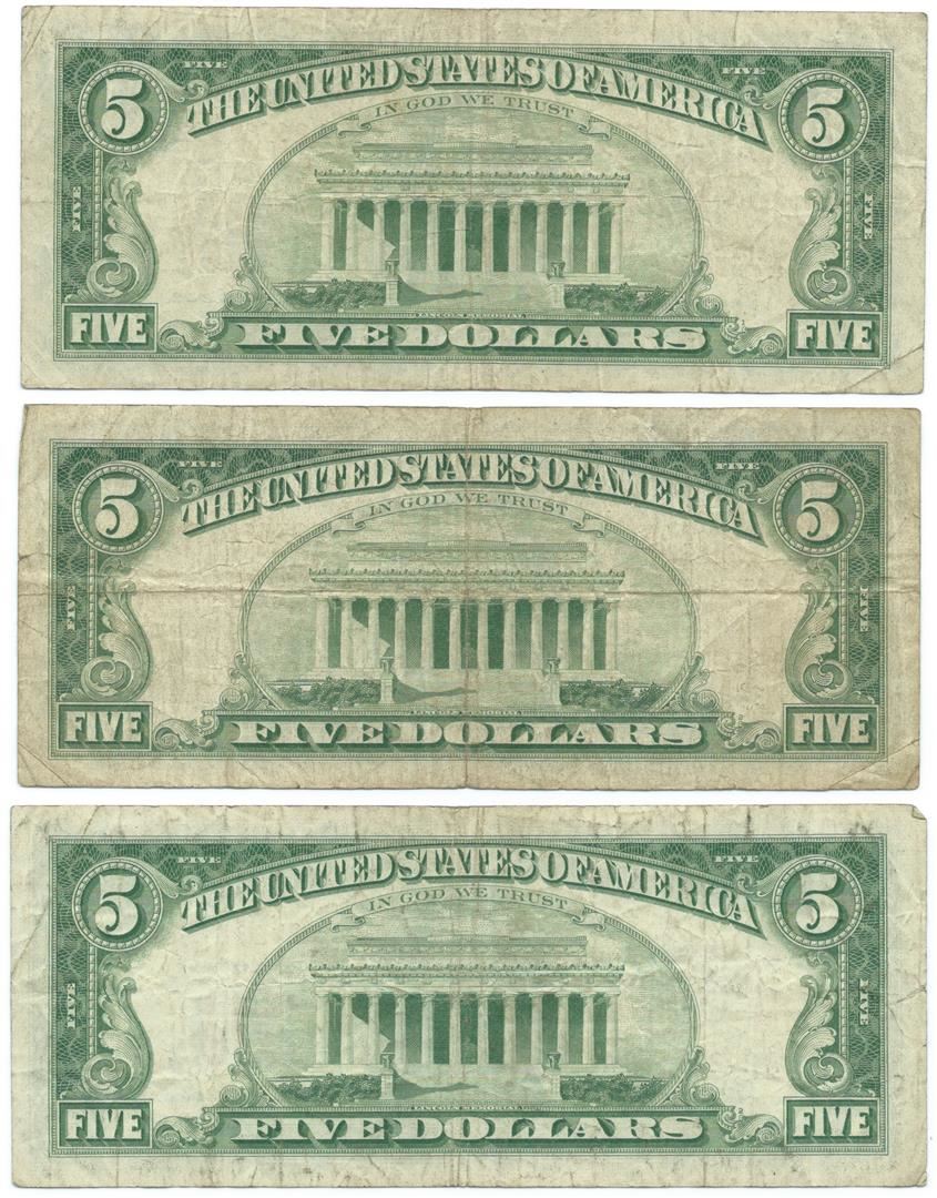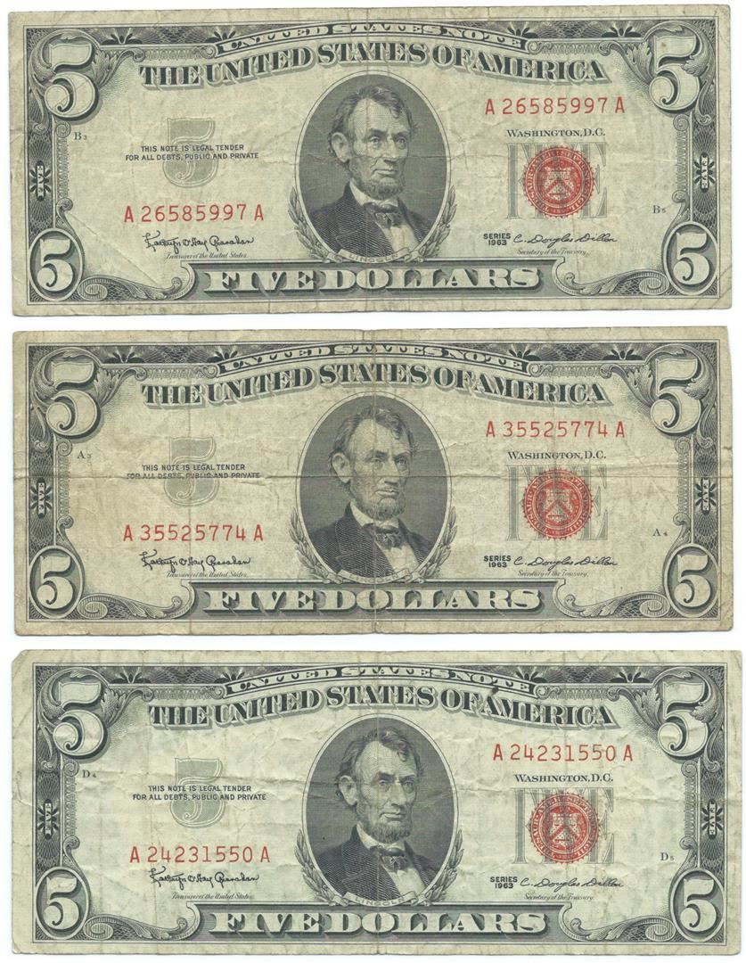 One 1963 $5 Fine Red Seal Bill Lot of 3.