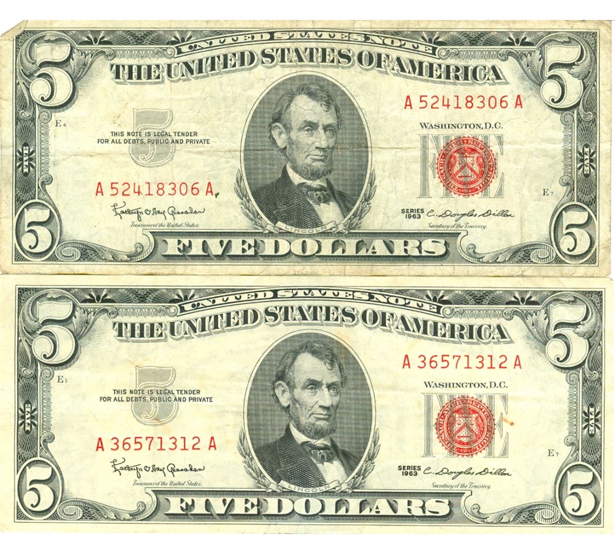 1963 $5 Red Seal Bill Lot of 2. Pictures represent the bills.
