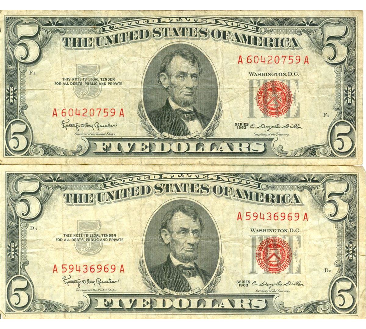 1963 $5 Red Seal Bill Lot of 2. Pictures represent the bills.