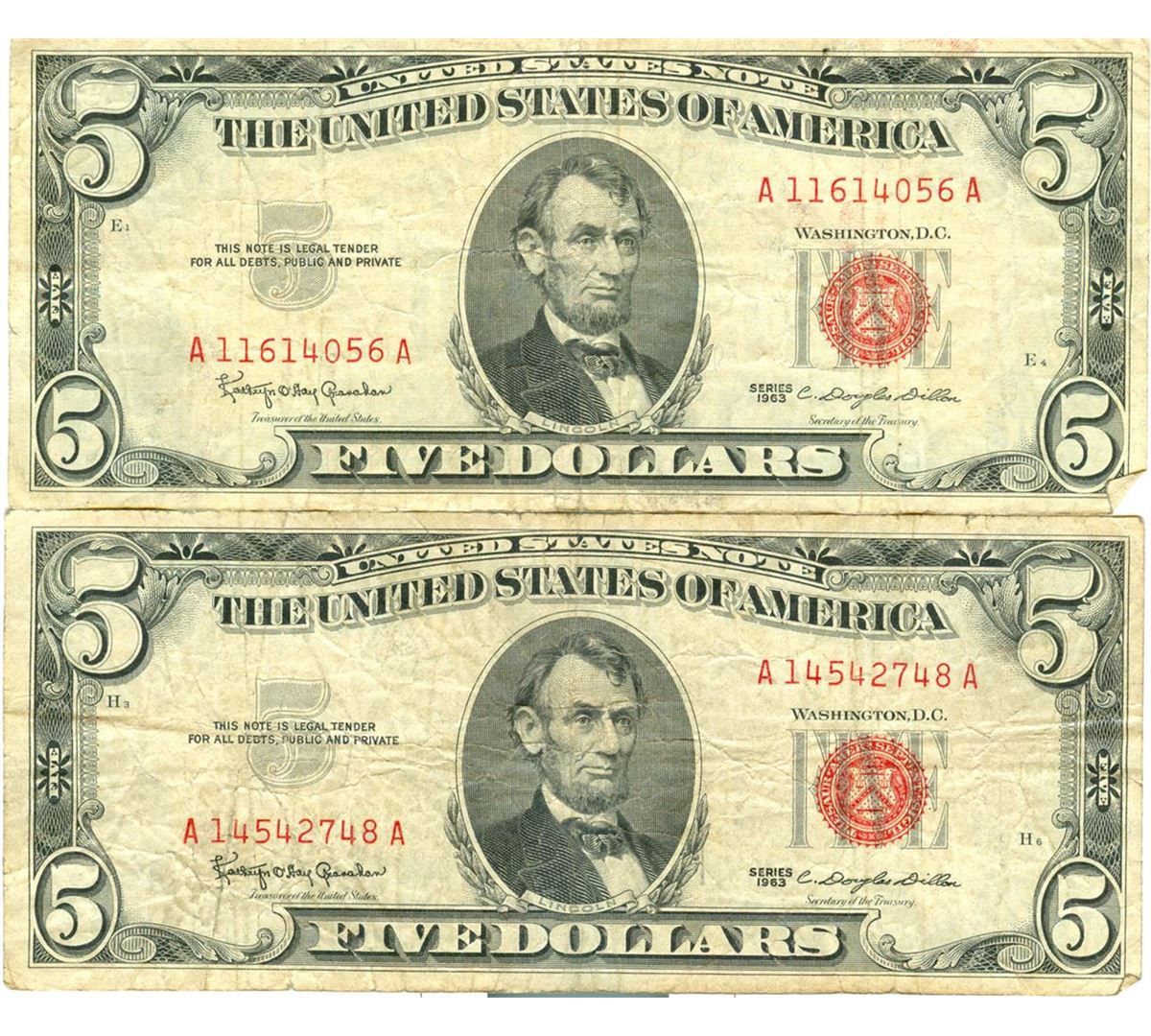 One 1963 $5 Red Seal Bill Lot of 2. The pictures represent the bills.