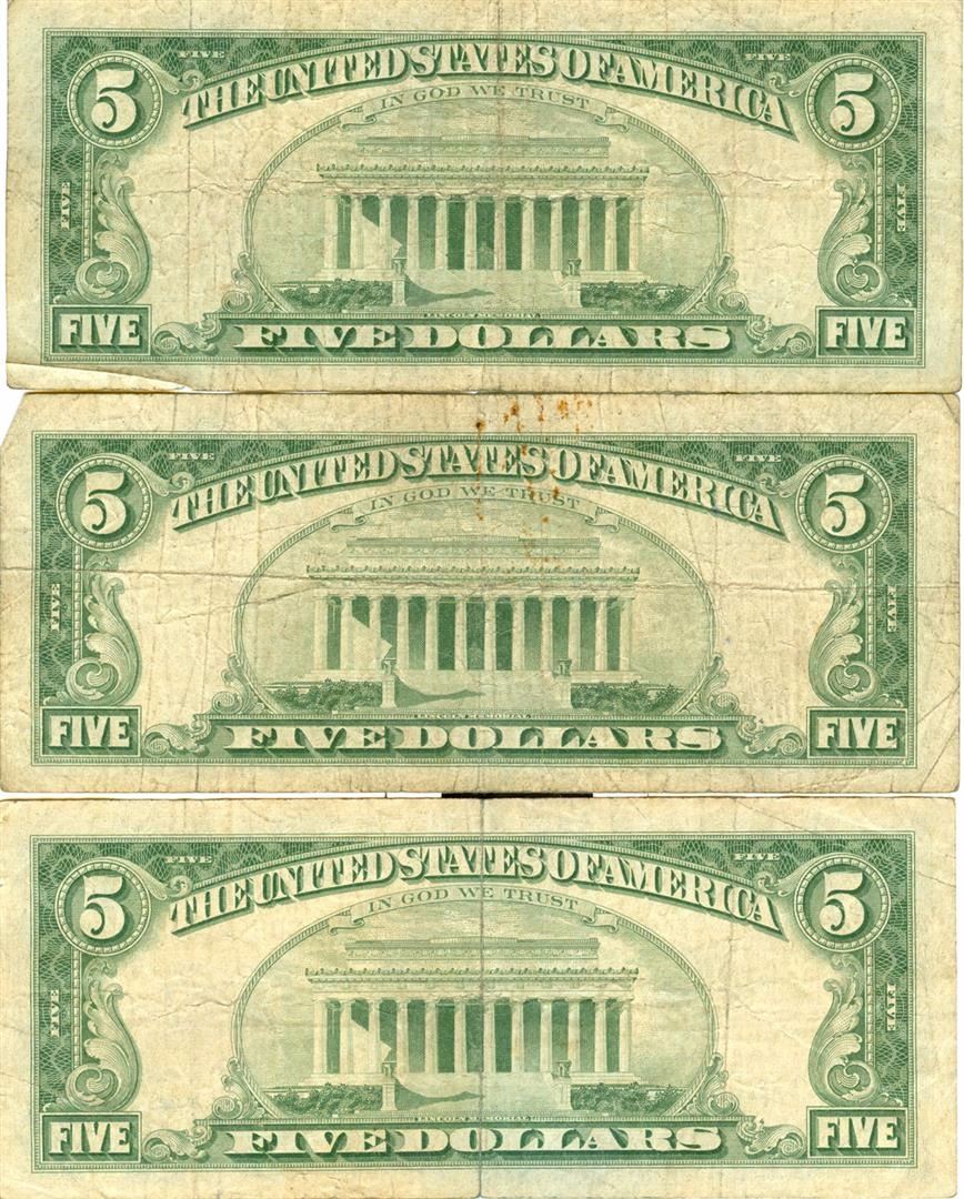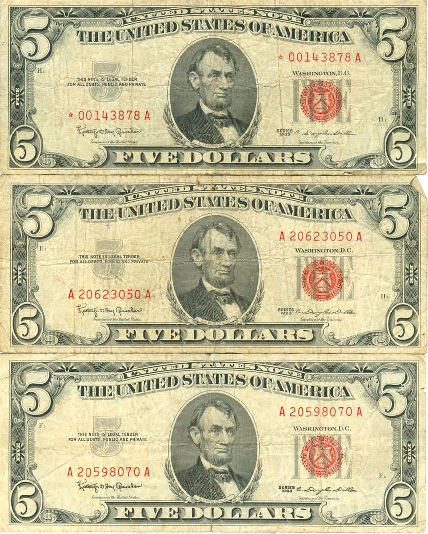 One 1963 $5 Red Seal Bill Lot of 3. The pictures represent the bills.